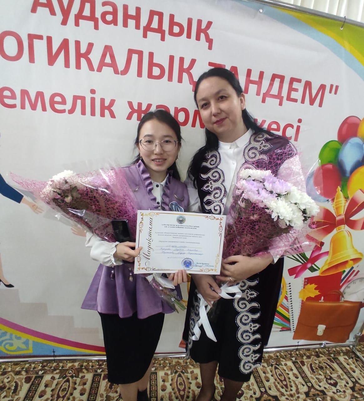 Аудандық "Педагогикалық тандем" әдістемелік жәрмеңкесінің "Бірлескен шығармашыл ізденіс" номинация иегерлері М. Жунусова мен А. Жұмашева номинация » Іле аудандық мектебі