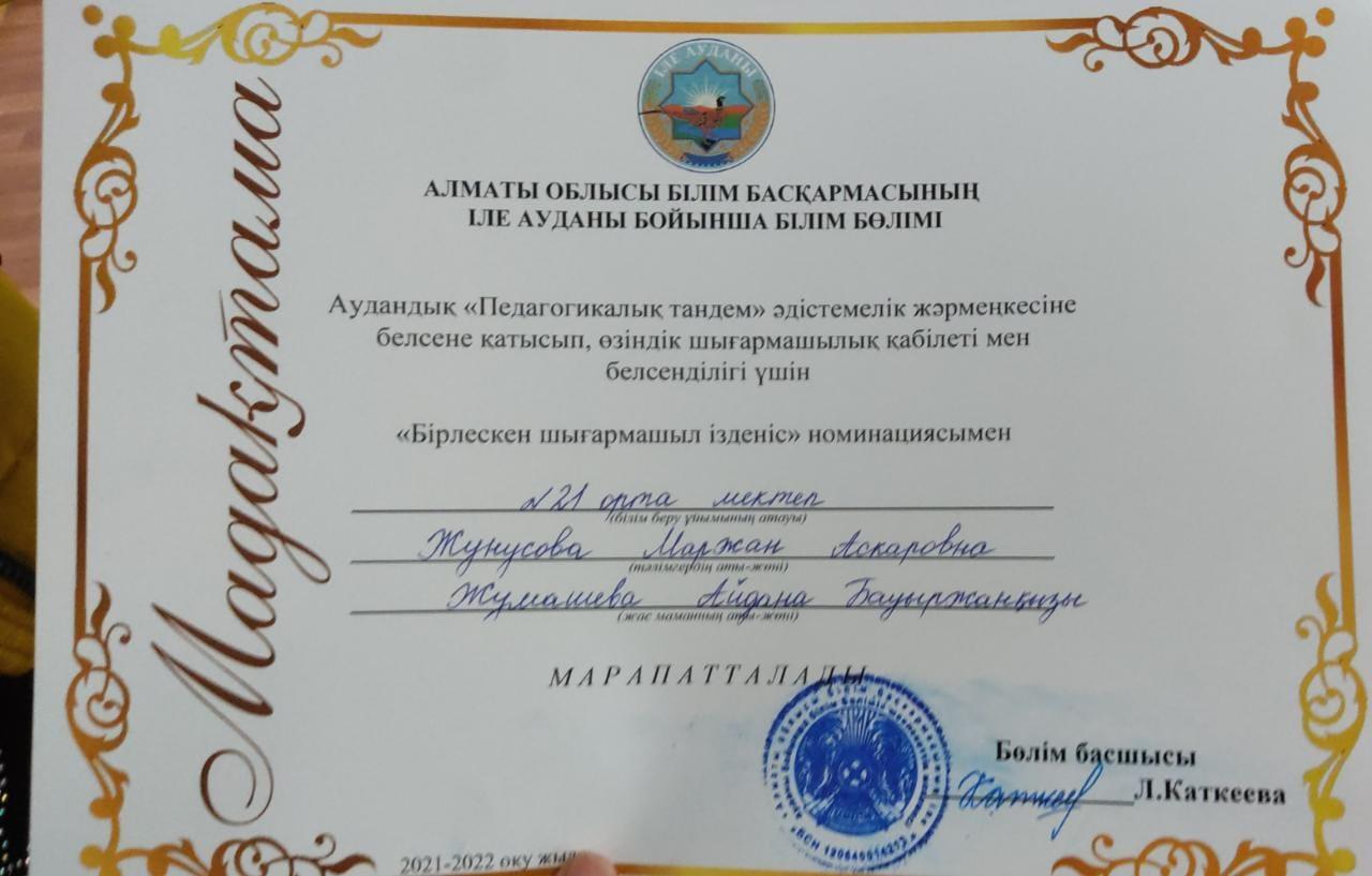 № 21 орта мектебі » Біз туралы » Әдістемелік жұмыстар » Аудандық "Педагогикалық тандем" әдістемелік жәрмеңкесінің "Бірлескен шығармашыл ізденіс" номинация иегерлері М. Жунусова мен А. Жұмашева номинация